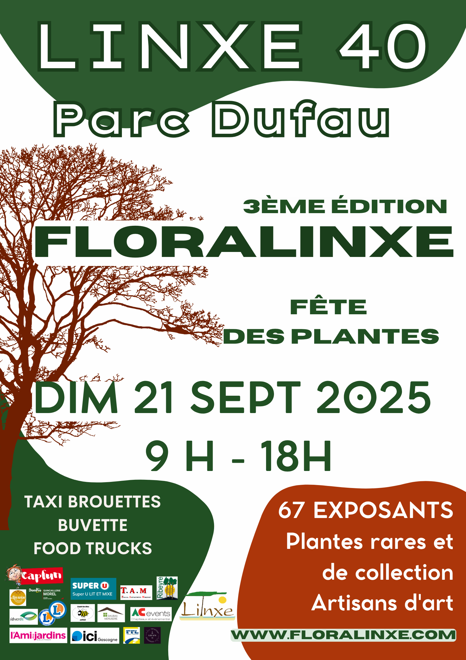 Floralinxe Publié le 31 juillet 2025 / Dernière modification le 31 juillet 2025 Floralinxe Publié le 31/07/2025 - Dernière modification le 31/07/2025 3ème Edition de Floralinxe Dimanche 21 septembre au Parc DUFAUde 9h00 à 18h00