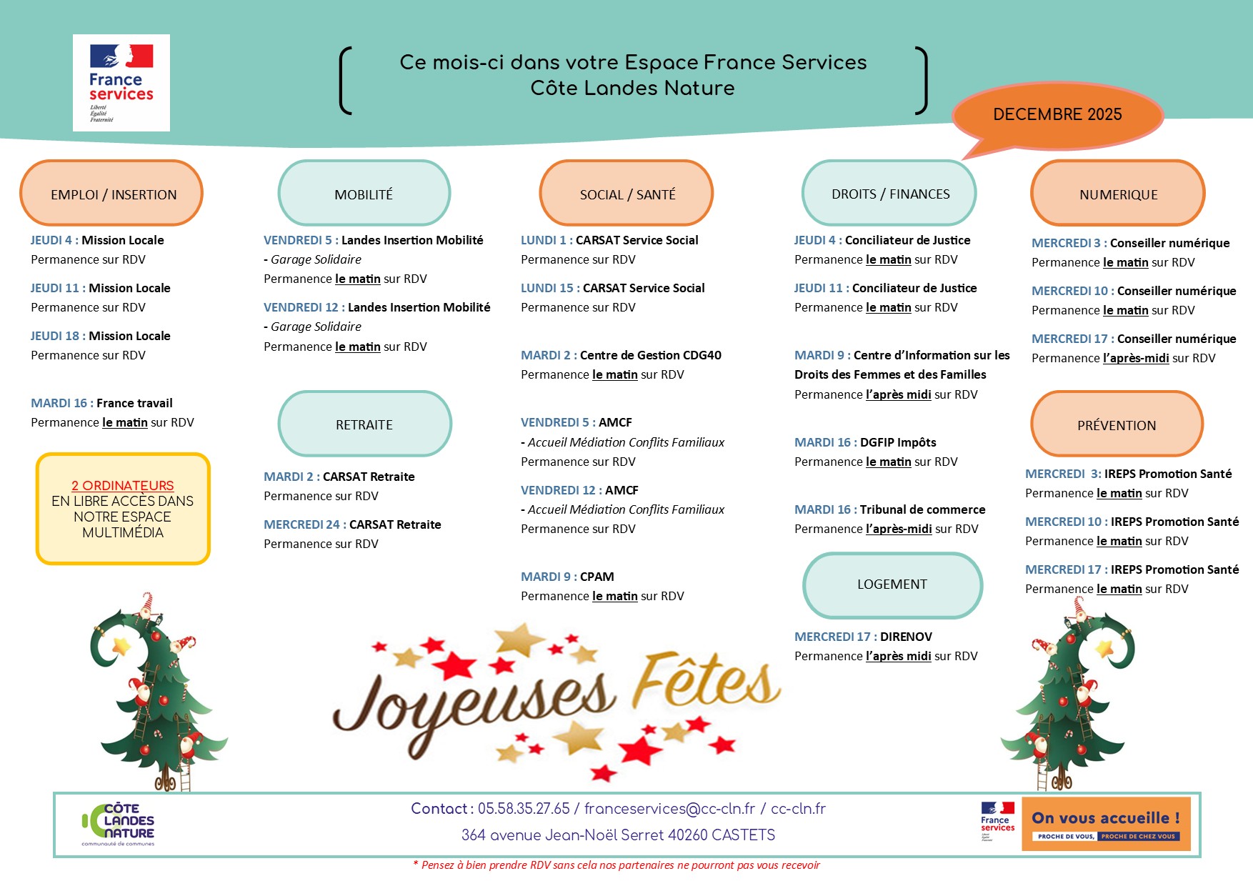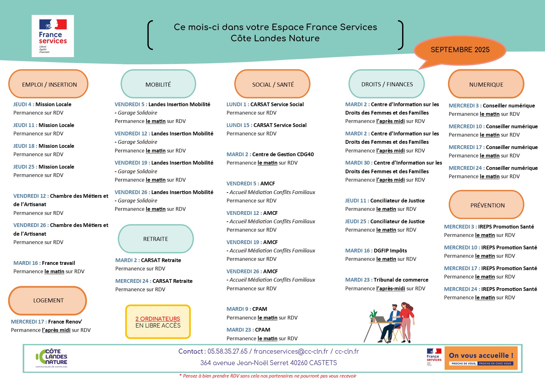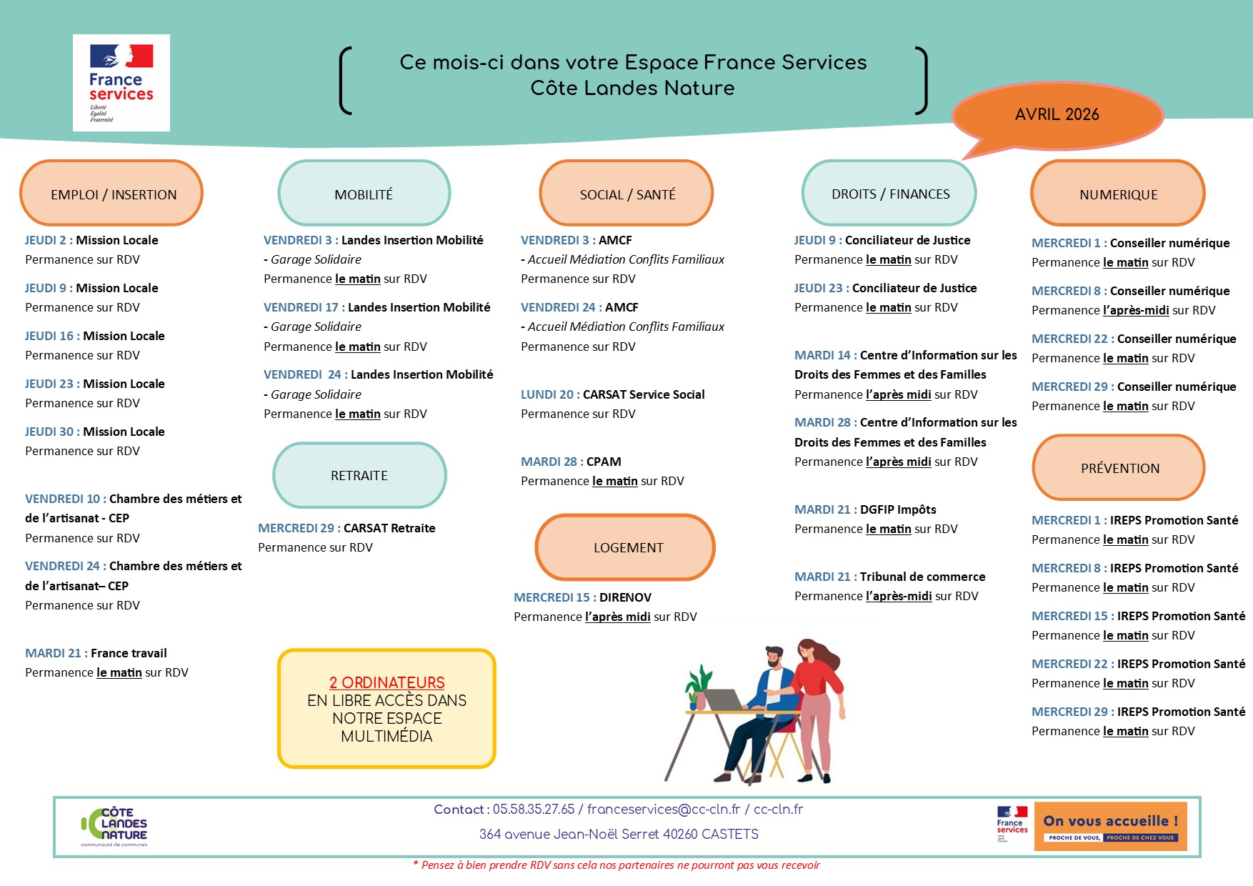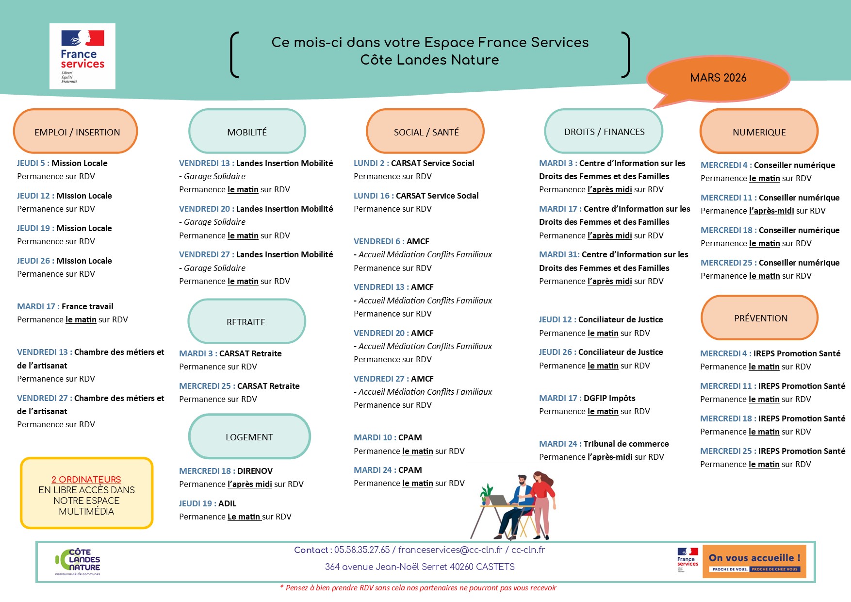 Espace France Service - Planning des partenaires Publié le 25 mai 2022 / Dernière modification le 27 février 2023 Espace France Service - Planning des partenaires Publié le 25/05/2022 - Dernière modification le 27/02/2023 Le planning des partenaires présents à l'espace France services est disponible.