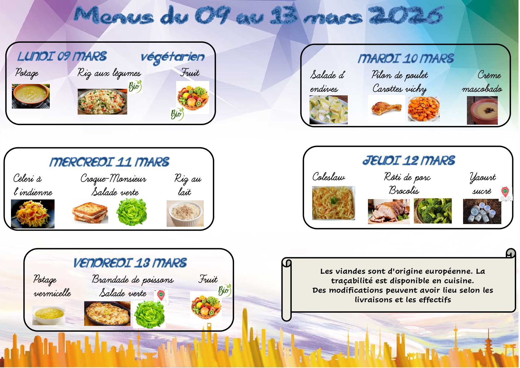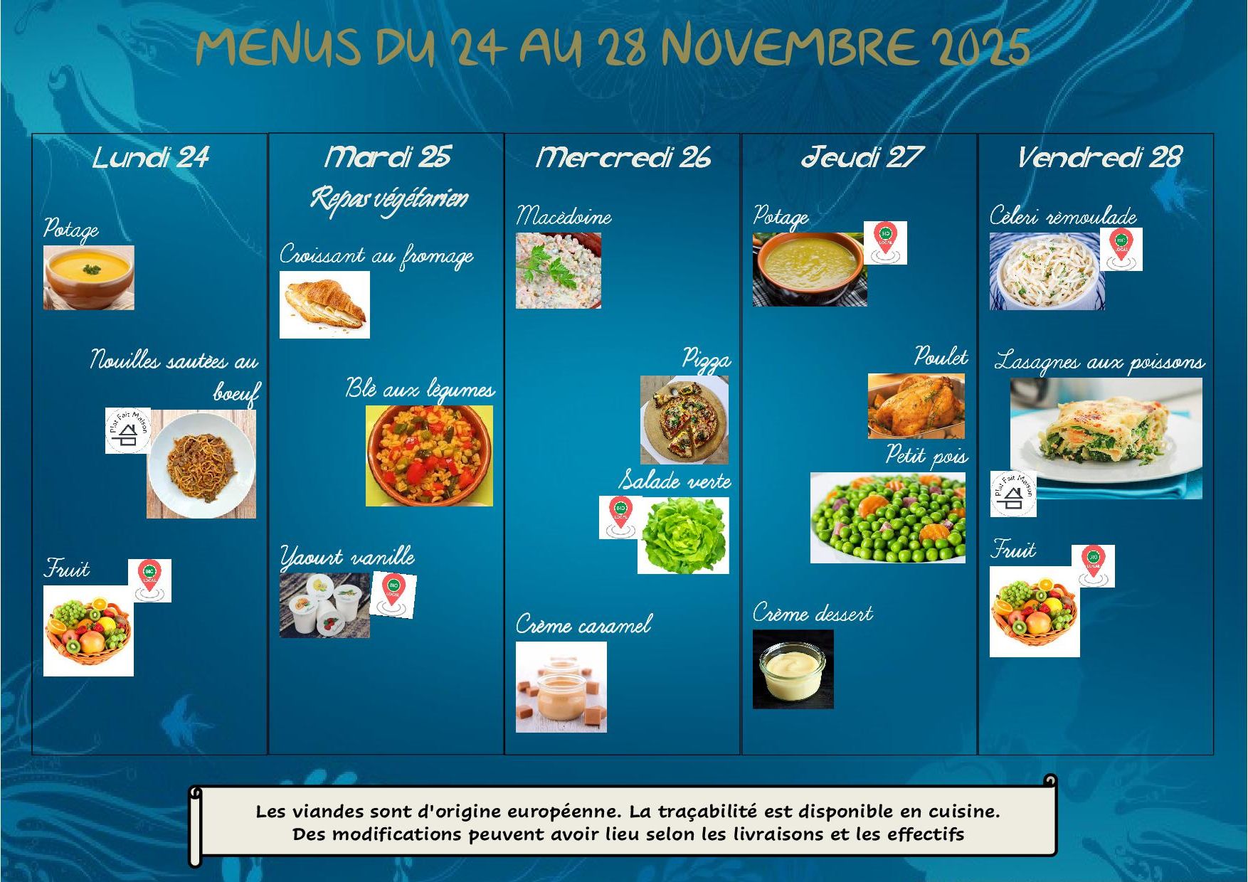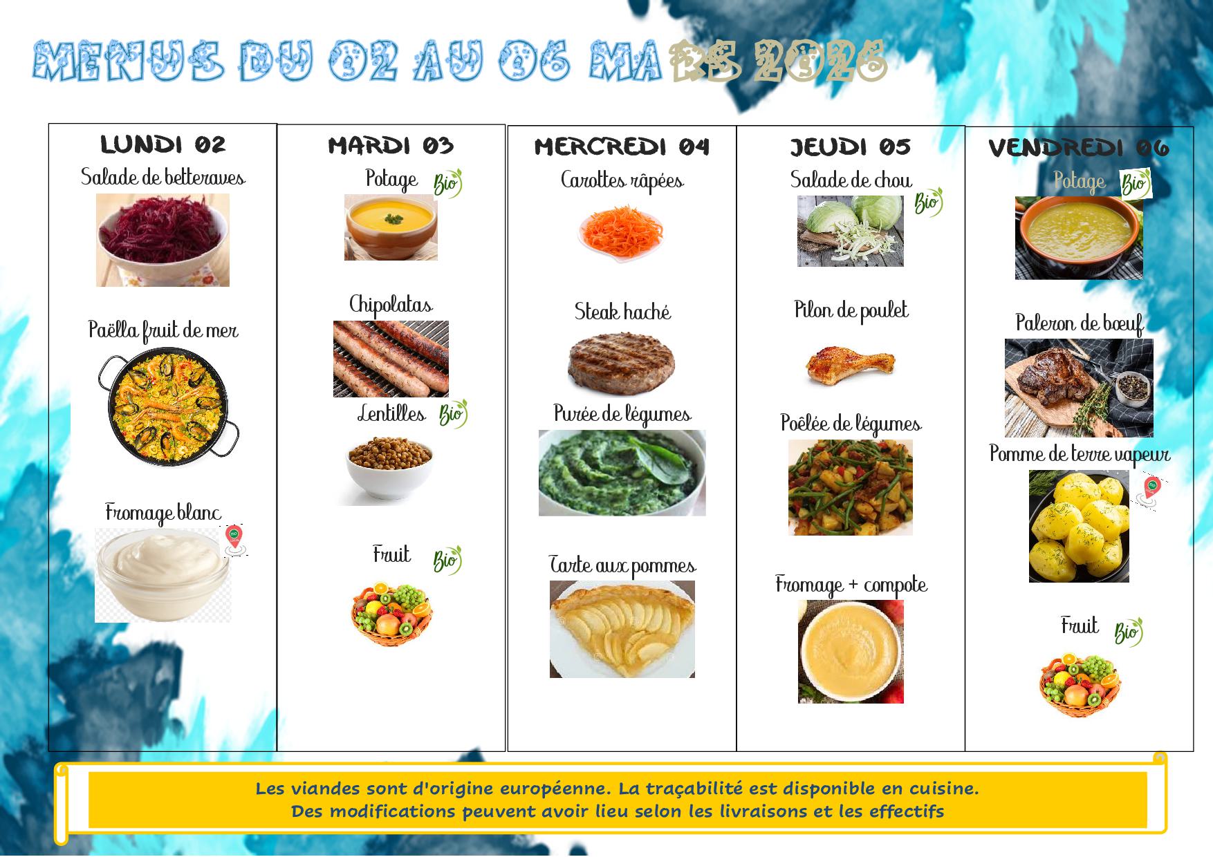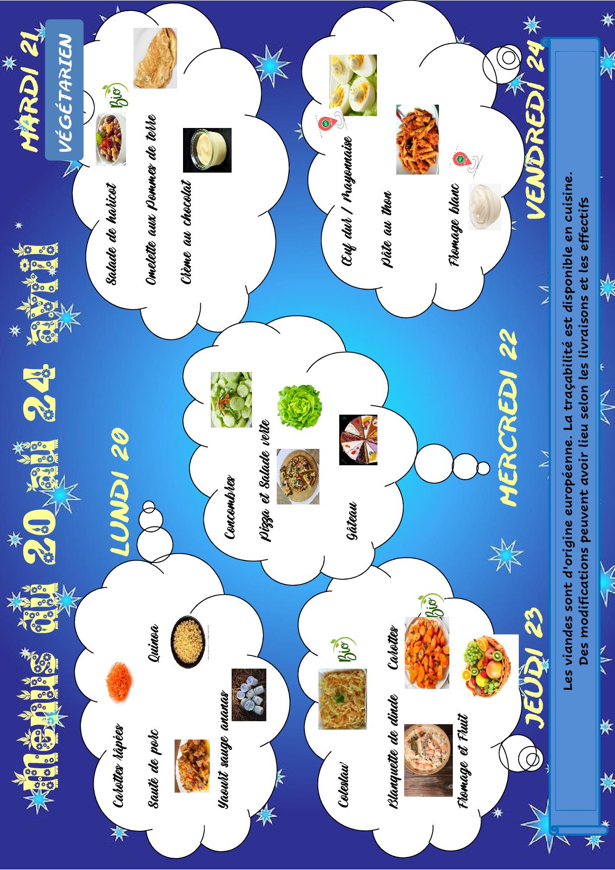 MENU DU RESTAURANT SCOLAIRE Publié le 04 janvier 2022 / Dernière modification le 26 mars 2024 MENU DU RESTAURANT SCOLAIRE Publié le 04/01/2022 - Dernière modification le 26/03/2024 Découvrez le menu du restaurant scolaire.